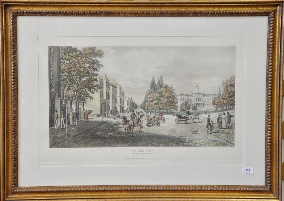 Louis Augier, New-York in 1819, Broadway and the City Hall, engraved in Aquatint by L. Augier and published by Sidney Z. Lucas New York City 1936, plate size 17 3/4 x 29. Provenance: Property from Credit Suisse’s Americana Collection