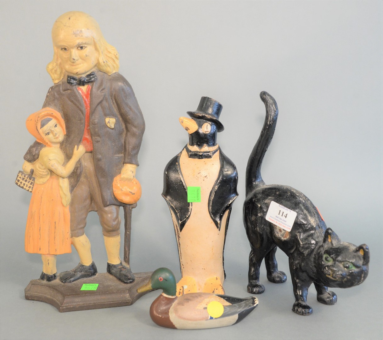 Four piece group of iron doorstops including a penguin, cat, duck, and colonial family man with child marked C.N., highest height 14 1/2 inches