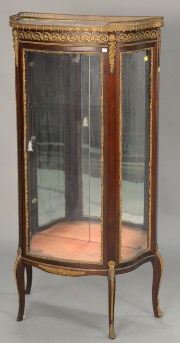 RJ Horner Louis XV style curio cabinet with marble top, brass mounts, glass shelves, mirrored back, and serpentine sides, early 20th century marble as is. ht. 52 1/2 in. wd. 25 1/2 in. dp. 12 in.