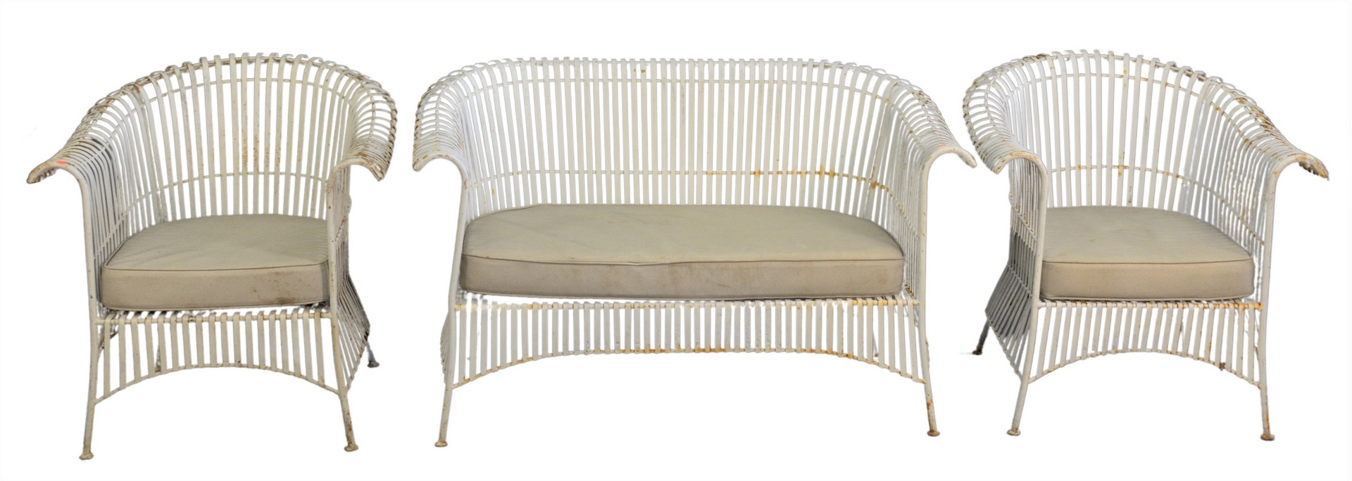 Russell Woodard Seven Piece Mid-century Outdoor Set, to include a pair of chaise lounges, pair of chairs, loveseat, along with a pair of tables, length 70 inches.