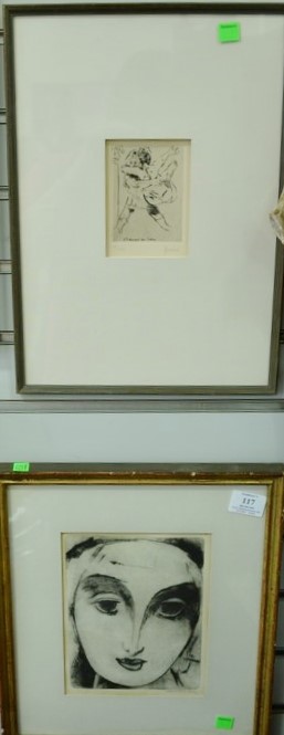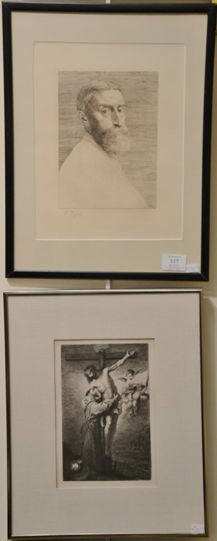 Group of four etchings including Clarence W. Anderson etching, Nude, signed lower right: C.W. Anderson, plate size 10 3/4 x 7 1/2 Alphonse Legros, Portrait of Edward J. Poynter Charles Albert Waltner 1846-1925, portrait etching, The Parish Clerk and unsigned etching of Christ at Cross. plate sizes 8 3/4 x 5 3/4 to 10 3/4 x 7 1/2 Provenance: Estate of Arthur C. Pinto, MD