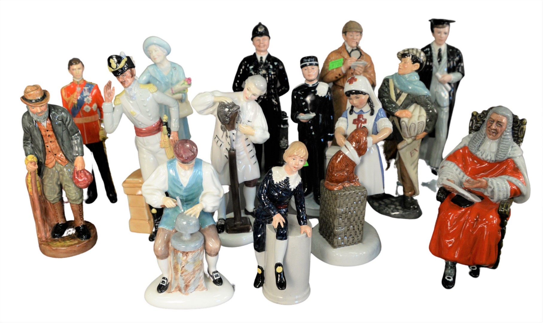 Group of Fourteen Royal Doulton Porcelain Figures, to include “The Silversmith of Williamsburg”, “The Caffer”, “Morning Ma’am”, “H.R.H. The Prince of Wales”, “Ritz Bell Boy”, “Little Lord Fauntleroy”, “The Graduate”, “It Won’t Hurt”, along with several others, each marked to the underside, height of tallest 9 inches. Provenance: Estate of James Wadhams.