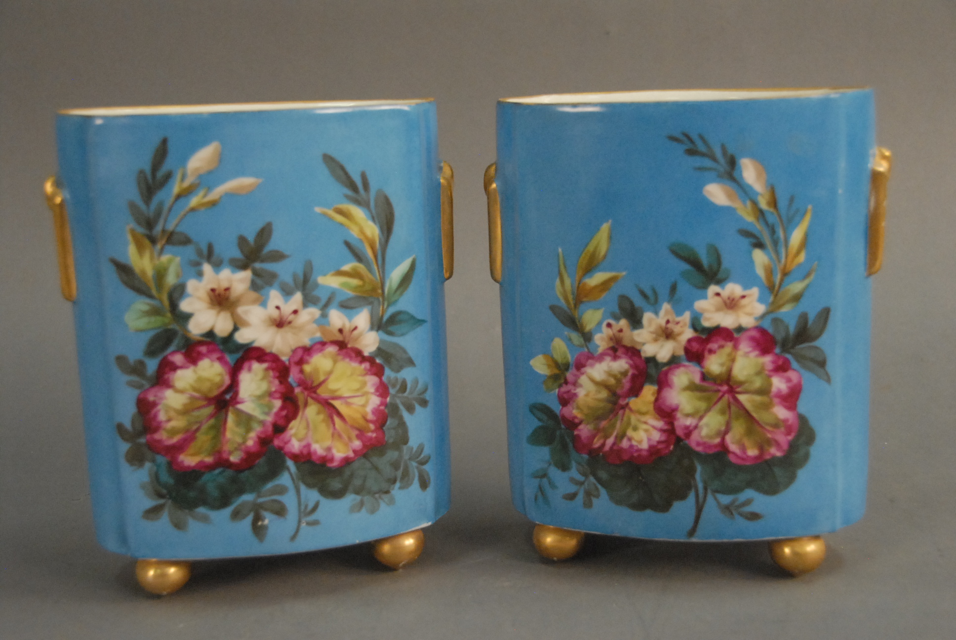 Lot 121: Pair of porcelain vases with painted flowers and ball feet.ht. 9 in.