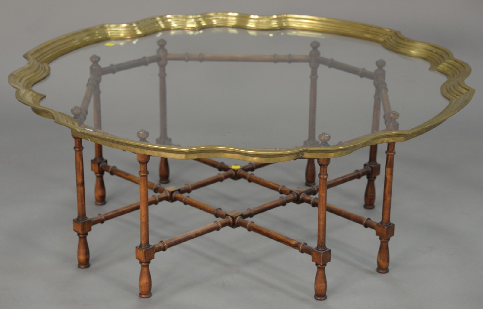 Lot 121: Baker coffee table with shaped glass, brass trim, and bamboo turned legs.ht. 17 in. top: 42 x 42