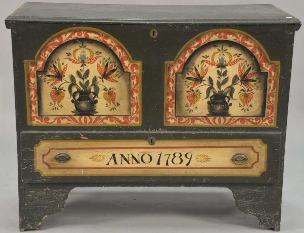 Lot 121: Lift top blanket chest with drawer on cut out bracket base, late 18th to early 19th century repainted. ht. 33in., wd. 42in., dp. 1…