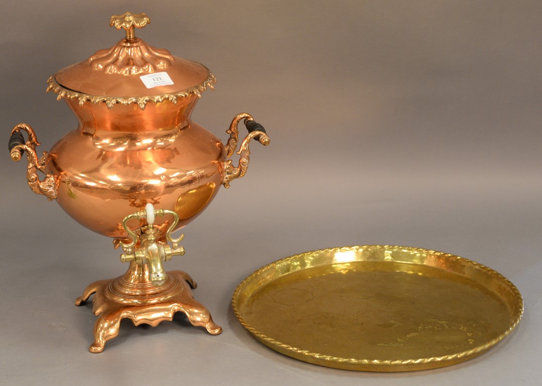 Lot 121: Victorian copper and brass tea urn, copper body with brass spigot on round brass tray. ht. 17in.