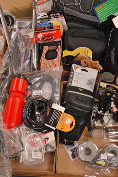 Four box lots: Commuter group bike, Rider group lot to include three bags, rack fender, three gloves, lock, Sigma RDS sport tools etc., approx. retail price 400.00.