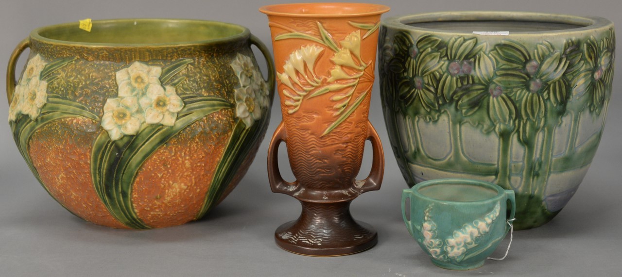 Four piece Roseville pottery lot including two small vases signed Roseville and two large pots unsigned. ht. 3in. to 9 1/2in. Provenance: Estate of Arthur C. Pinto, MD