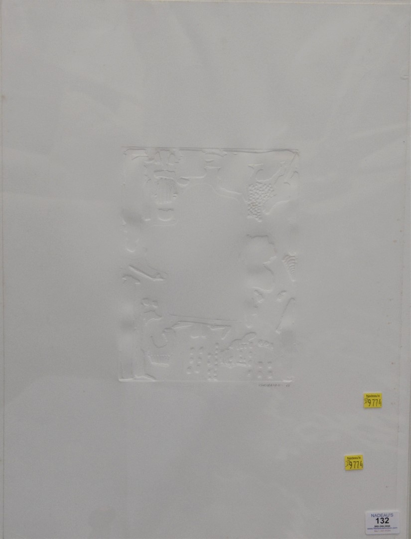 Two Piece Group to include Stephen Antonakes (1926 – 2013), Dream, 1965, silkscreen on pillowcase, edition of 100, not numbered; signed lower right ‘Antonakos’, cloth: 13 1/2″ x 17 1/2″, Byron Gallery, New York, label on back; along with a Ezio Gribaudo lithograph, signed ‘Gribaudo 66’, 24″ x 18″. Provenance: Property from the Estate of Alexis Gregory, Sold to Benefit the Alexis Gregory Foundation