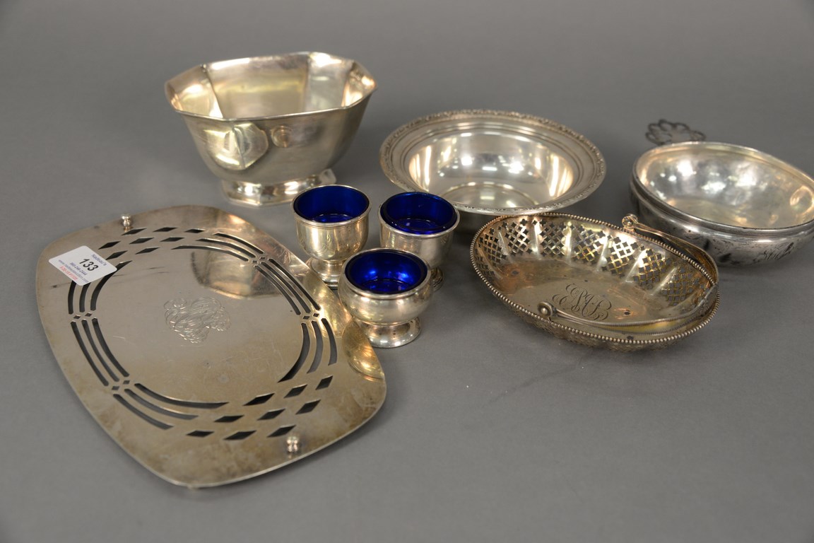 Group of seven hand painted French and Italian Faience including 12 in. melon plate, bag pipe wall pocket, an additional wall pocket, large bowl & cover, sugar, and two plates.