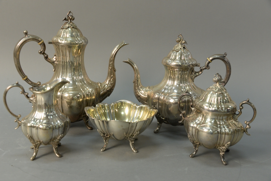 Reed and Barton sterling silver tea and coffee service to include teapot, coffee pot, sugar bowl, creamer, and waste bowl. coffee pot: ht. 11 3/4in., waste bowl: ht. 3 1/2in., 121.32 t oz.