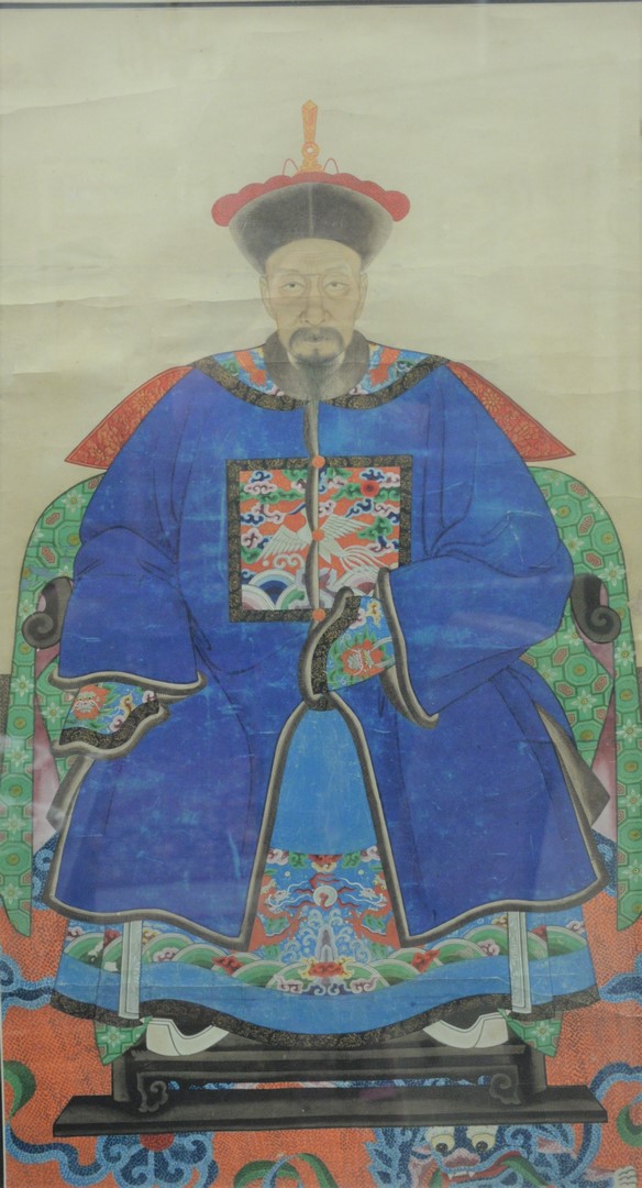 Framed Chinese Ancestral Portrait Painting 19th century watercolor on paper depicting ancestor portrait of man seated wearing blue robe with flying crane Provenance: From the Robert Cerciello Collection, West Hartford, Connecticut