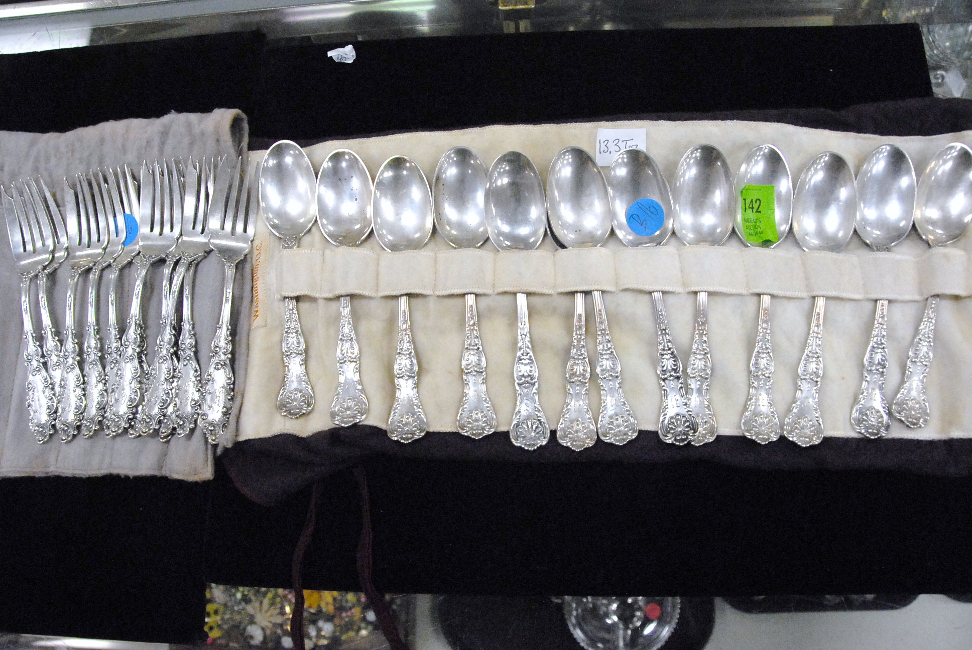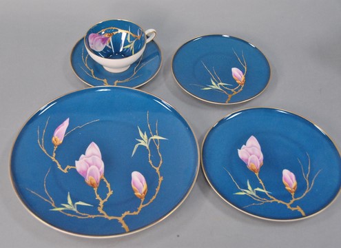 Selb Bavaria Heinrich hand painted partial china set signed Carole Stupell hand painted by Hackel with high relief gold including seven dinner plates, ten lunch plates, bread plates, cups, and saucers, 47 pieces in all.