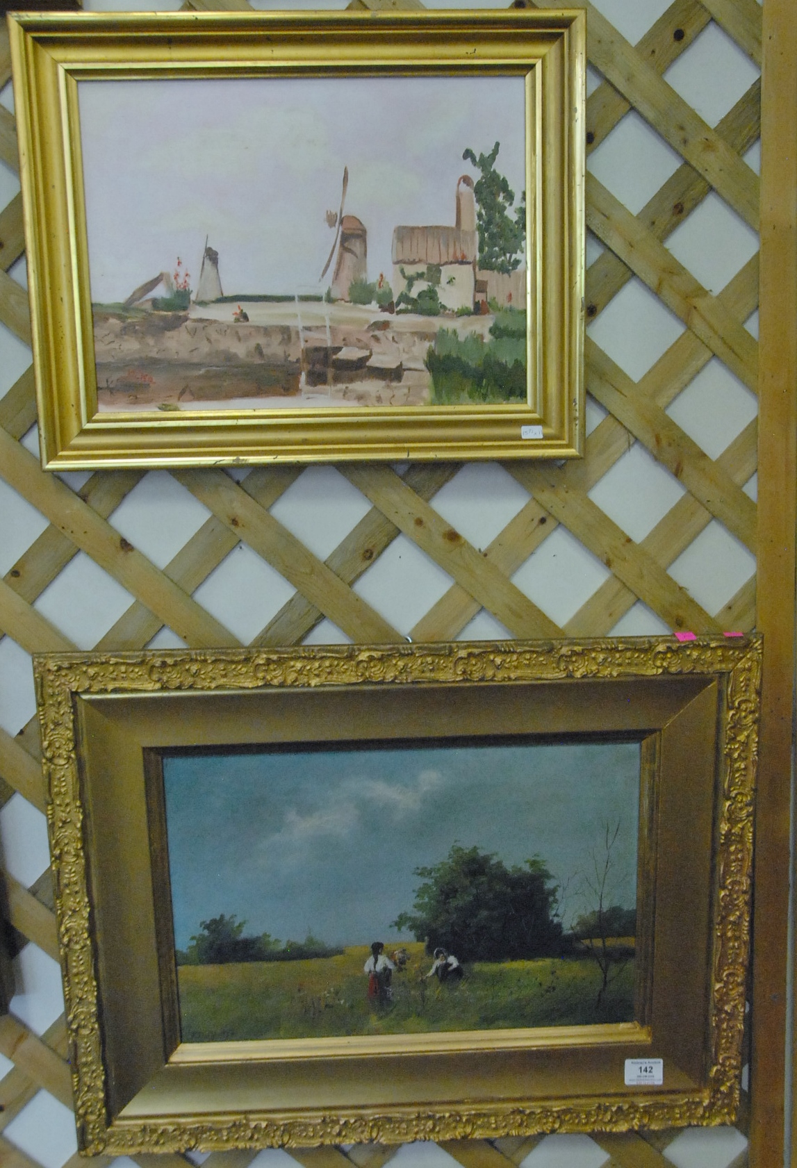 Louis Bouche 1838-1911, oil on board, canal with bridge, entitled on verso Bridge, Paris, signed lower right L. Bouche, marked lower left June 1911, Kraushaar Galleries label on verso, 7 x 9.