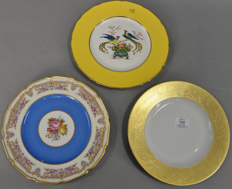 Three sets of porcelain plates including set of twelve LImoges dinner plates, set of eight Ovington Bro’s. plates and a group of six Bavaria dinner plates with heavy gilt border. dia. 10 1/4in.