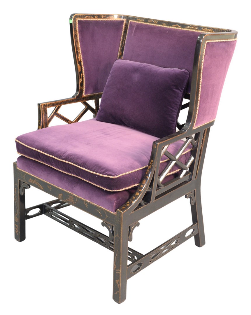 Chinese Style Arm Chair, having custom upholstery and chinoiserie decorated frame, height 44 inches, width 34 inches. Provenance: David and Cynthia Kim, 22 Stoney Wylde Lane, Greenwich, Connecticut. View home by visiting: https://www.zillow.com/homedetails/22-Stoney-Wylde-Ln-Greenwich-CT-06830/177238281_zpid/