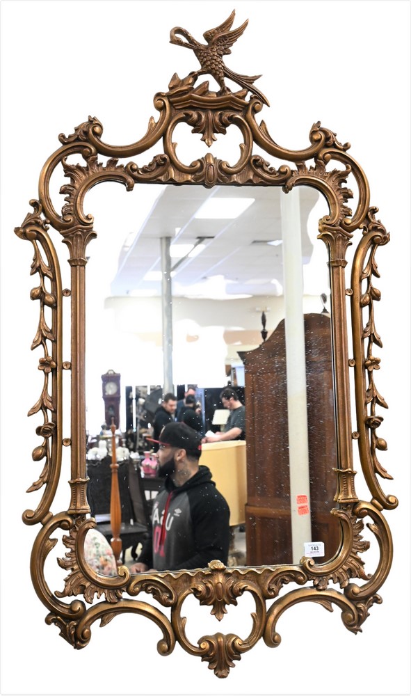 Margolis mahogany chest of four drawers with block front having triple shell carved top drawer with large brass handles, gadrooned skirt and ogee feet, branded Margolis 1930 top in need of refinishing. height 37in. width 38in.