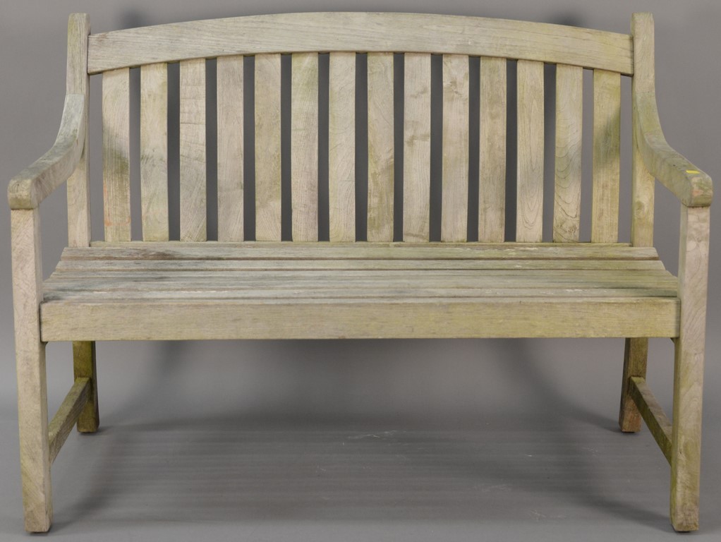 Teak bench having arched back, signed Scan Com. lg. 47in.