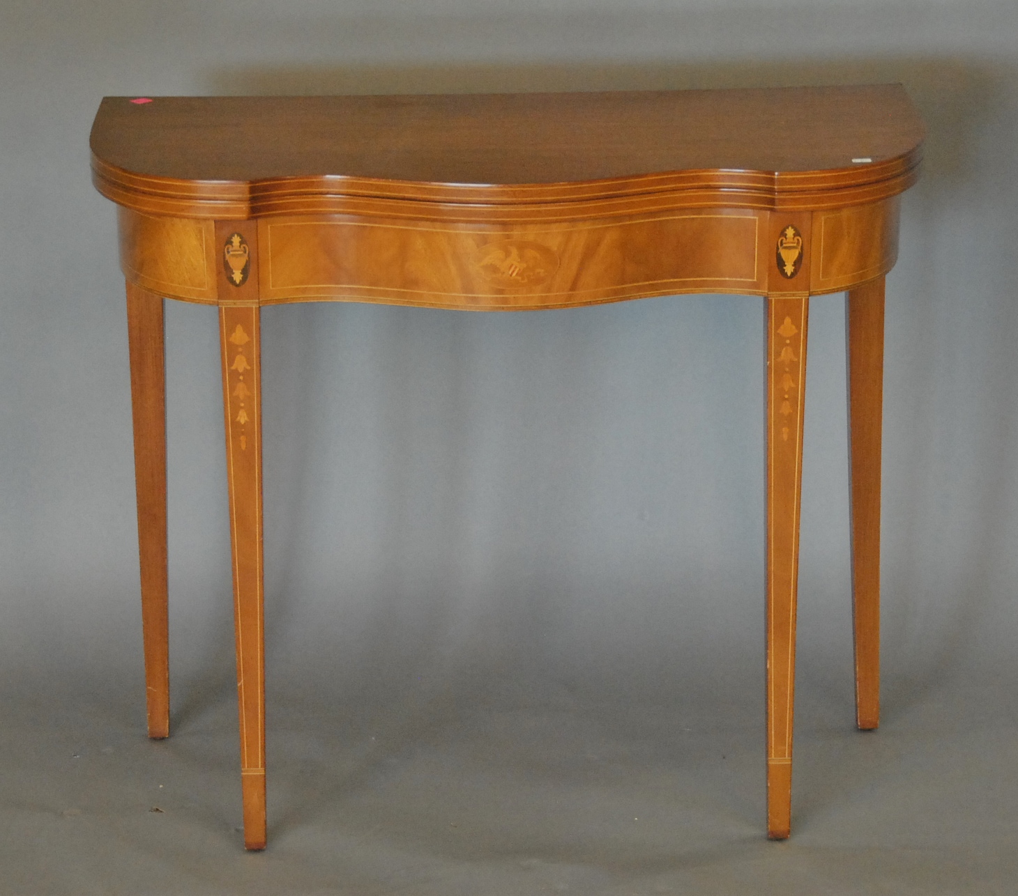 Sheraton mahogany game table, top with blocked shaped center over conforming frieze all set on turned and fluted legs, frieze with figured light wood panels, circa 1830. ht. 30in. wd. 36in.