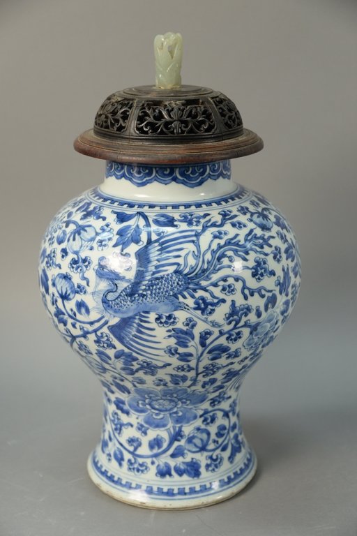 Chinese blue and white Meiping phoenix bird porcelain vase having reticulated carved top with hardstone finial. ht. 18in. Provenance: Collection of Anne Jones Willis and the late John Ralph Willis, New Jersey