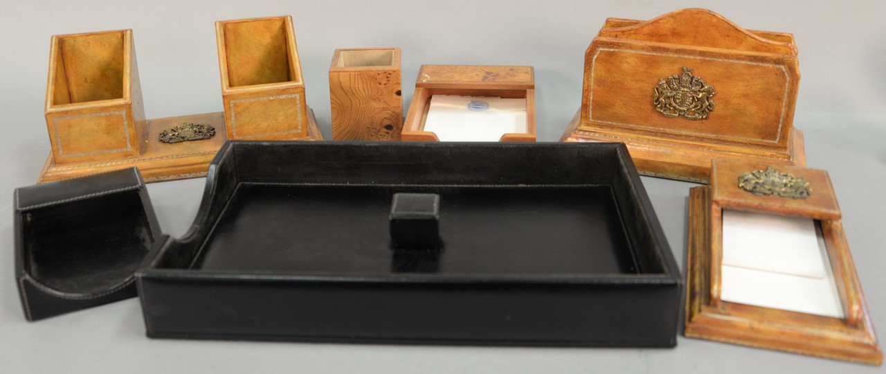 Two leather desk sets including a tan three piece set, possibly Maitland Smith letter holder: ht. 7in., lg. 10in. and a three piece T. Anthony black leather set, plus three miscellaneous pieces.