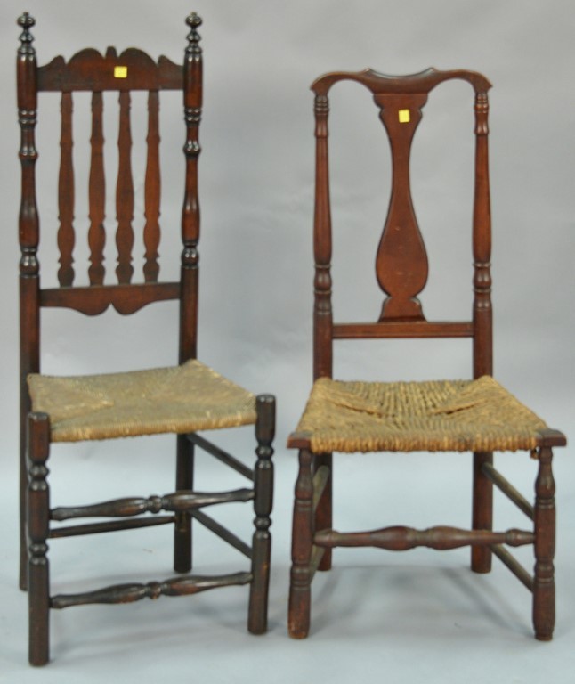Two primitive side chair including side chair with splat back and turned stretcher base and side chair with banister back. seat ht. 17in., total ht. 44 1/2in. & seat ht. 16in., tota ht. 40 1/2in.