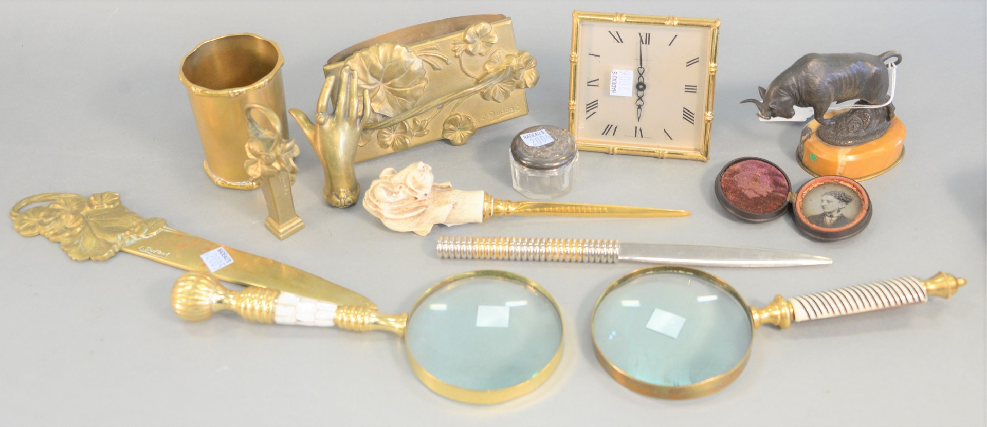 to include a small Tiffany & Company clock two magnifying glasses two letter openers one small tintype photograph small brass cup along with a small bronze bull