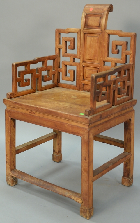Chinese softwood armchair with scrolled back above pierced and paneled backrest and sides, and paneled seat on molded square legs joined by stretchers. Provenance: Collection of Anne Jones Willis and the late John Ralph Willis, New Jersey