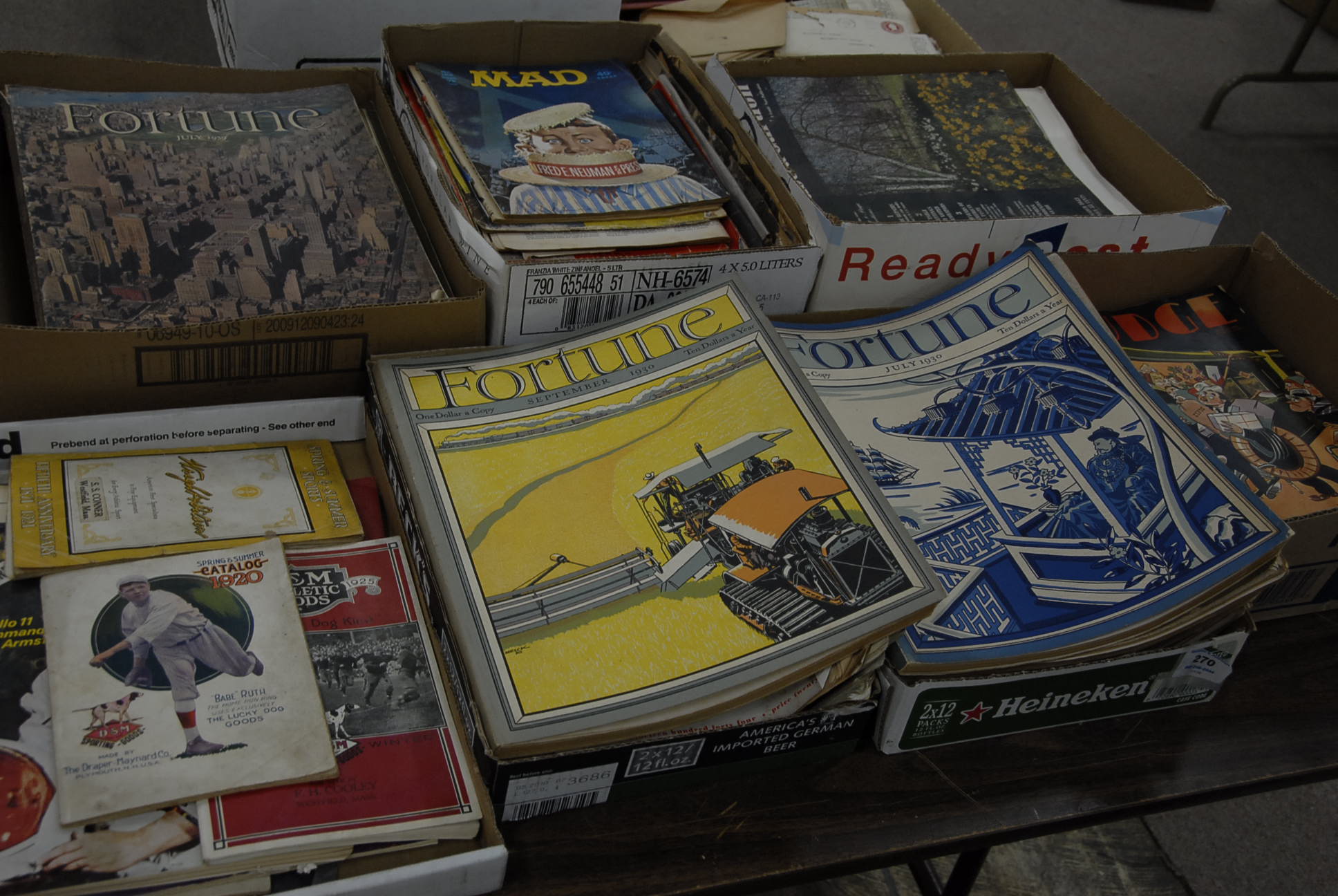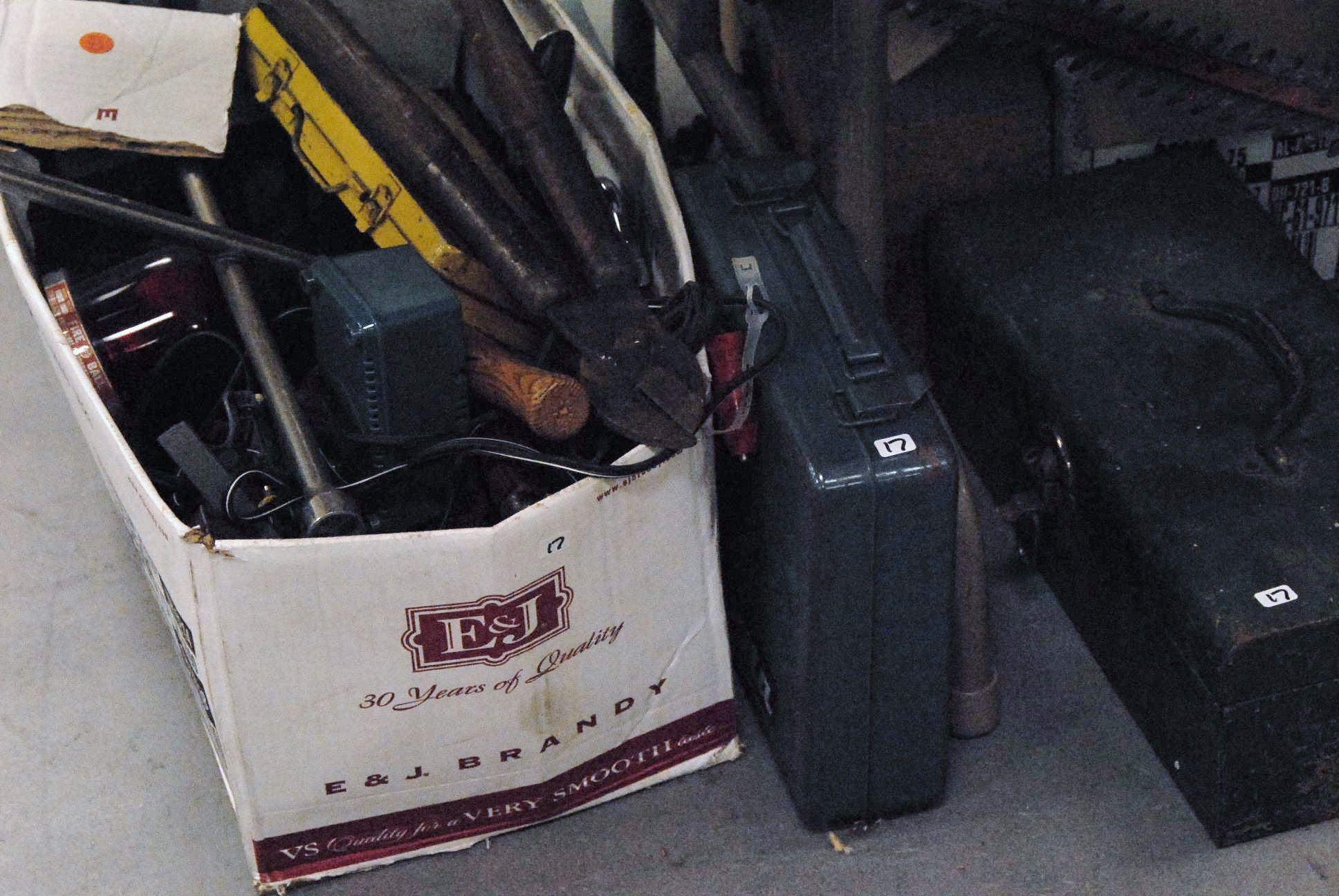 Large grouping, including early wooden crates, Sunshine Biscuits, National Biscuit Company, Chocolate crate, part of a wine press, couple of small bookcases, bamboo bookcase, O.G. mirror, washboards, oak bed, headboard and footboard, Victorian, a haying rake, floor lamp, two gold decorated frames, three Radio Flyer Flexy Flyer sleds.