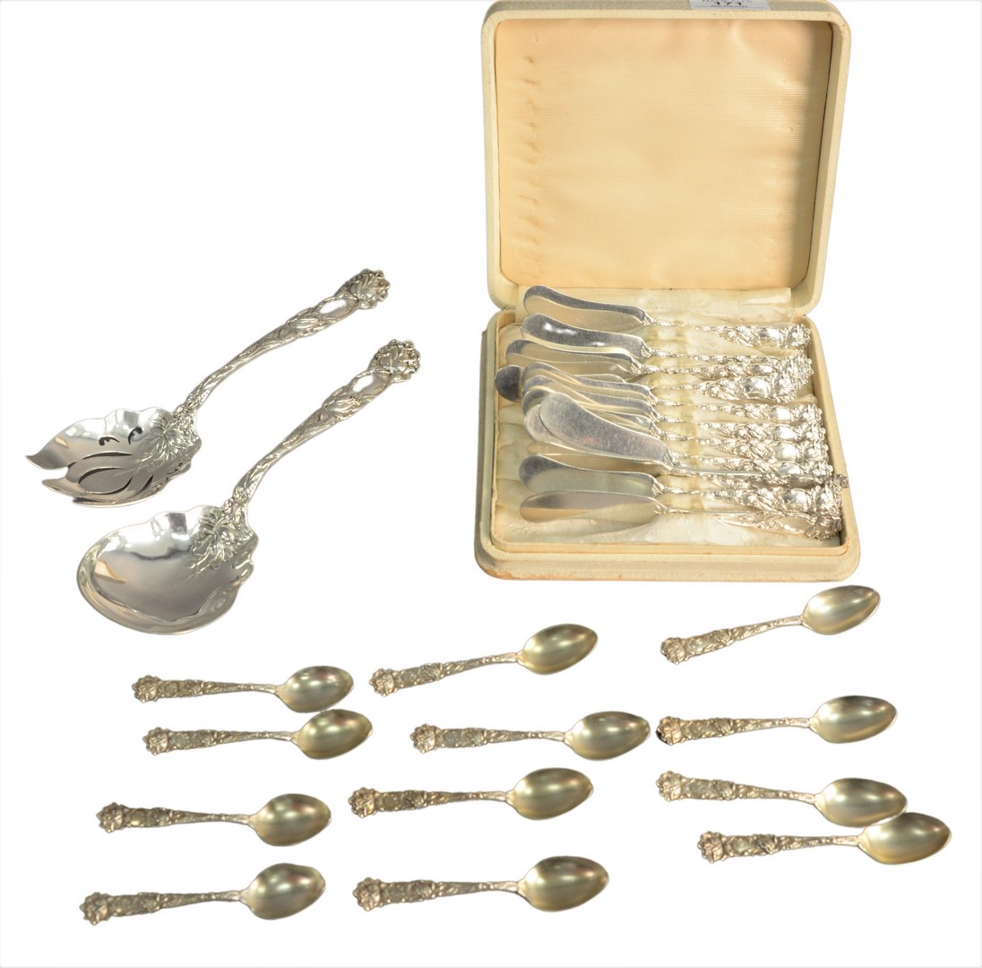 Reed & Barton Francis I flatware set to include 20 lunch forks, 12 dinner forks, 12 small bouillon spoons, 27 cocktail forks, 26 hors d’oeuvres forks, 20 ice cream forks, 27 salad forks, 10 steak knives, 13 butter knives, 2 master butter knives, 20 luncheon knives, 16 dinner knives, 31 soup spoons, 31 teaspoons, 2 large teaspoons, 4 ladles, 4 small serving pieces, 4 serving spoons, 1 cocktail server, 4 piece cutlery set, 3 serving pieces with sterling silver handles. 271.7 t oz. plus 67 handles.