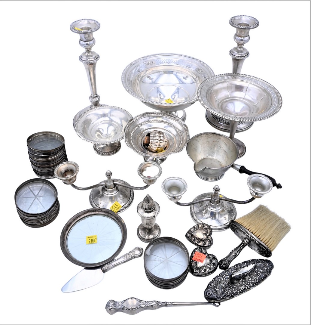 81 Piece English Sterling Silver Flatware, in ‘Old Maryland’ style pattern, 8 dinner forks, 8 lunch forks, 5 salad forks, 6 cocktail forks, 12 teaspoons, 6 soup spoons, 6 bouillon spoons, 4 demitasse spoons, 4 butter knives, 7 dinner knives, 7 lunch knives, 8 serving pieces, 74.2 t.oz., along with 19 weighted handles.