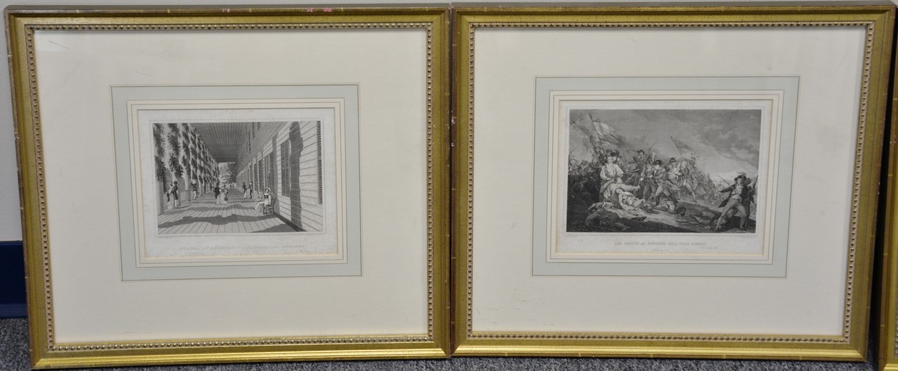 Set of ten framed black and white engravings including Saratoga by Illman, Battle of Bunker Hill by Boilly, Beverly Massachusetts, New York Archer, Niagara Hunt, Hinshelwood, Brandard, Mt. Washington and Woodcock, average sight size 7 1/2 x 10. Provenance: Property from Credit Suisse’s Americana Collection