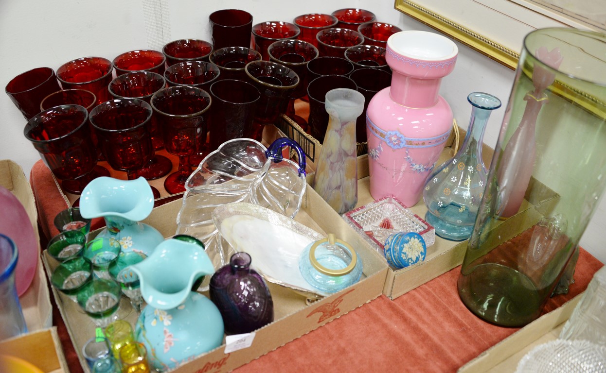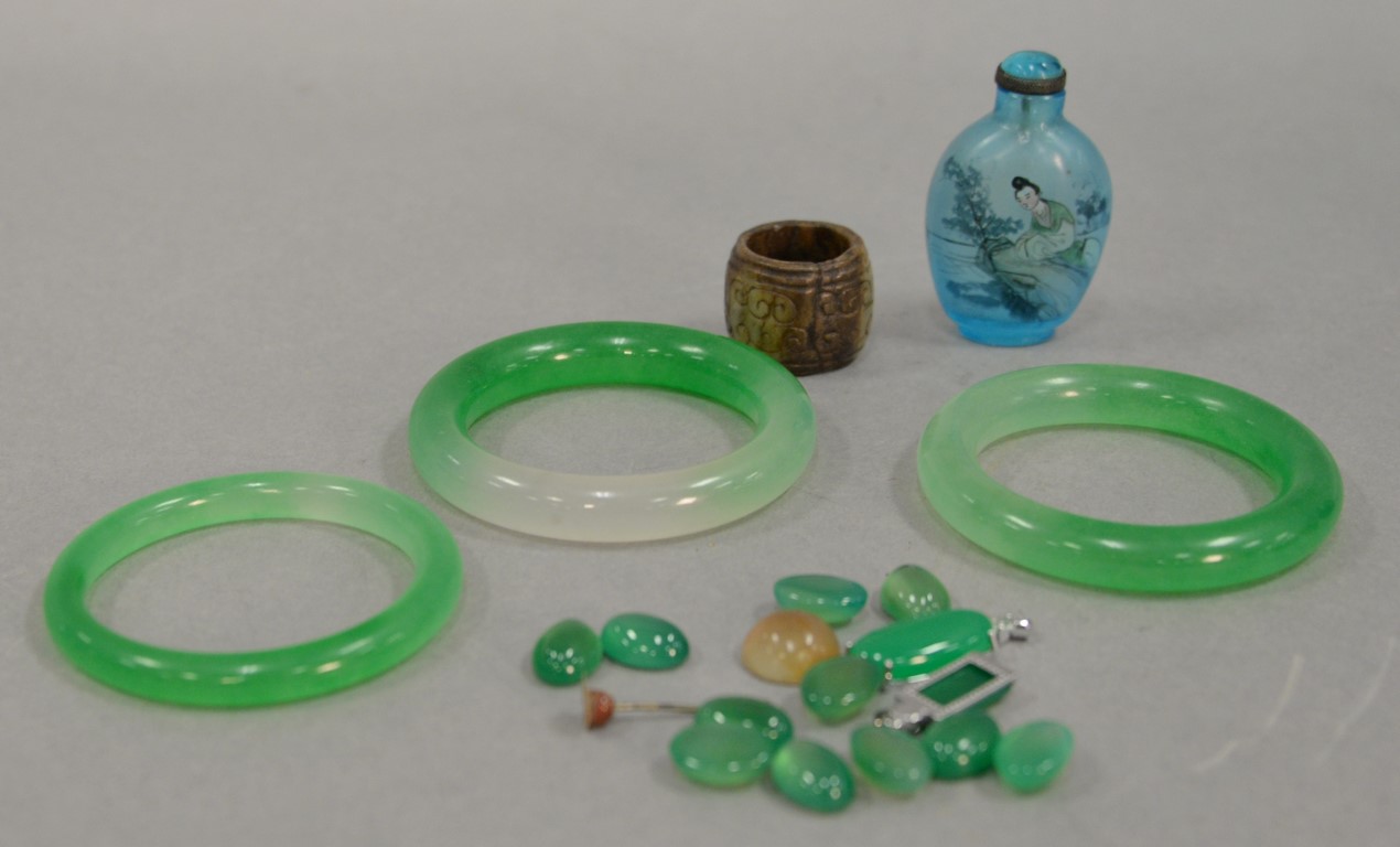 Four box lots to include various animal figures, Ginori tea set, green and white, a few cups and saucers, two Satsuma vases as is, brown salt glazed pitcher, candle snuffer and a holder