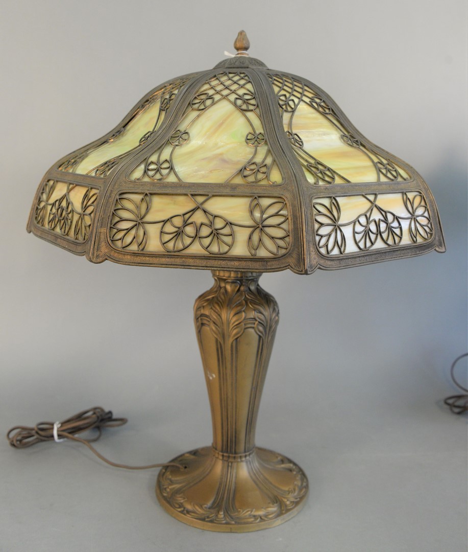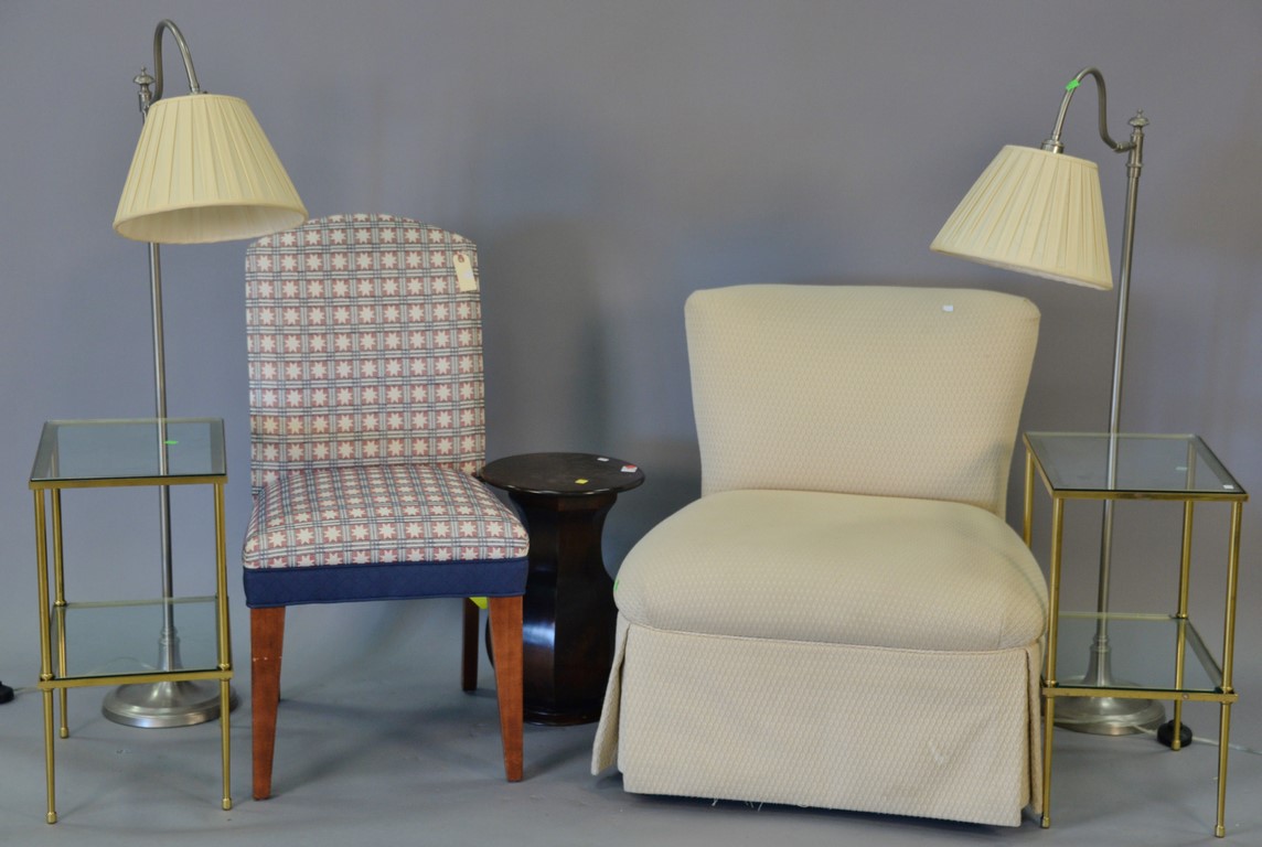 Contemporary seven piece lot to include two upholstered chairs, two stainless floor lamps, a round stand ht. 19in., and a pair of glass and brass two tier stands.