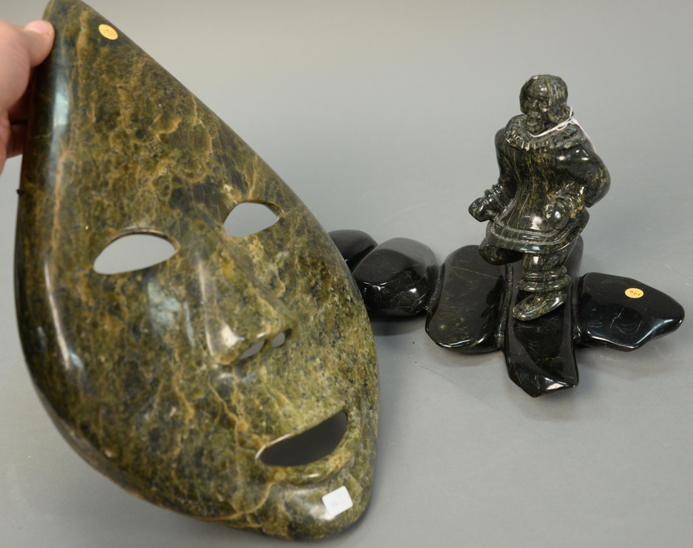 Two Inuit Eskimo carvings Taqialuq Nuna 1958 Cape Dorset serpentine Mask Provenance: Waddington’s, 15 1/2 and Pootoogook Jaw 1959 Cape Dorset black serpentine Drum Dancer with Shadow provenance: Gallerie Elca London, Montreal, Canada, ht. 8in., lg. 12in..
