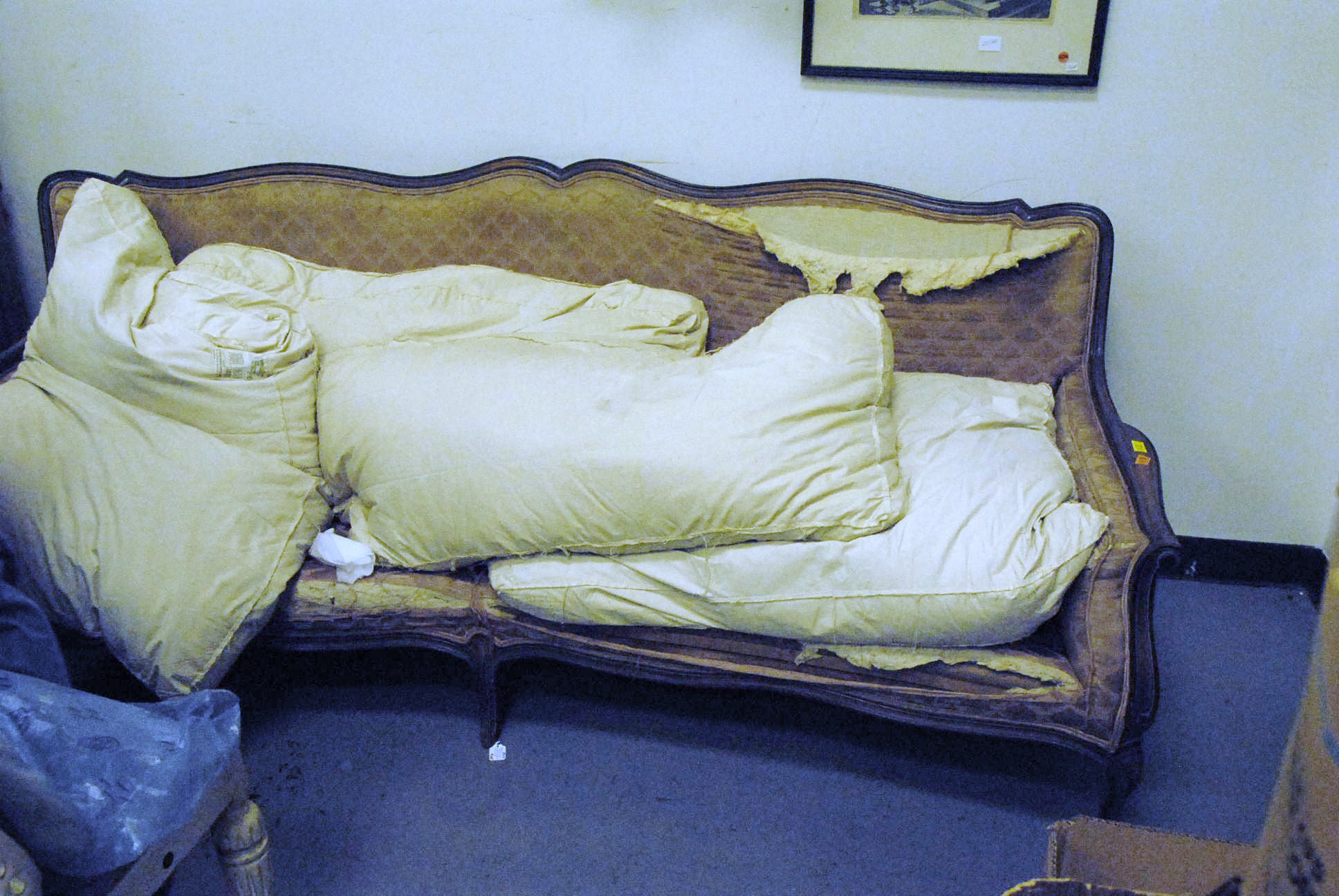 Large group of furniture to include Sheraton style chest, drum table, two over two drawer chest, ladder back chairs, vinyl cover chair, sled, fan, small tables, painted chest, footstool etc.