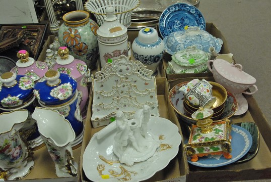 Six box lots including apothecary covered jars, candelabra vases, letter holder, covered dish, French porcelain ink well, Meissen dish, French Porcelain letter holder, Oriental vases, Wedgwood, etc.