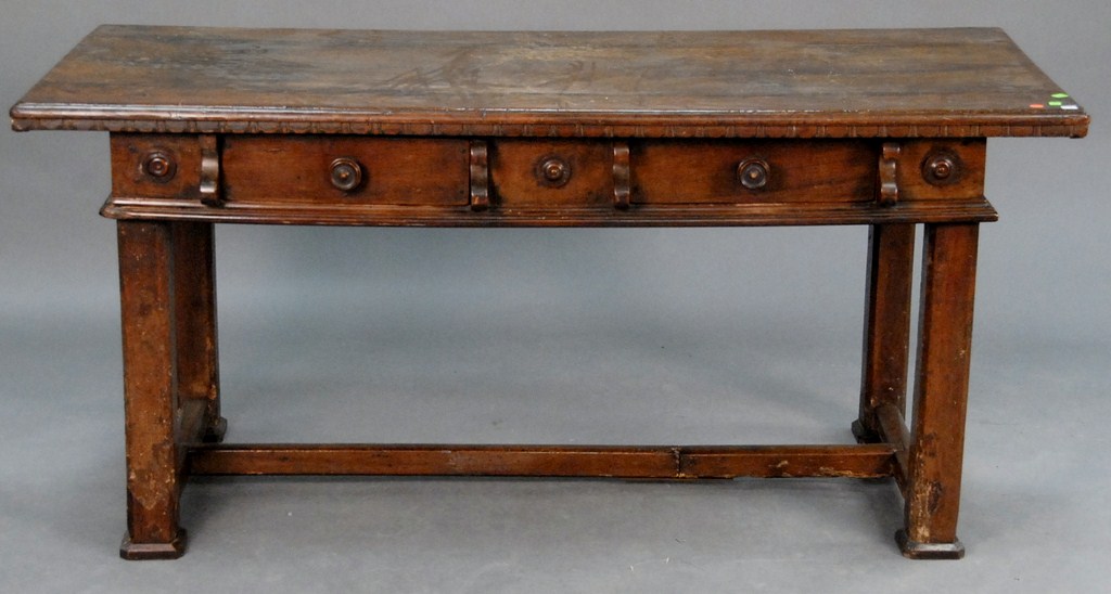 Continental walnut work table with rectangular top over two drawers in frieze on four squared legs and stretcher base, probably 17th – 18th century. ht. 30in. top: 28 x 64