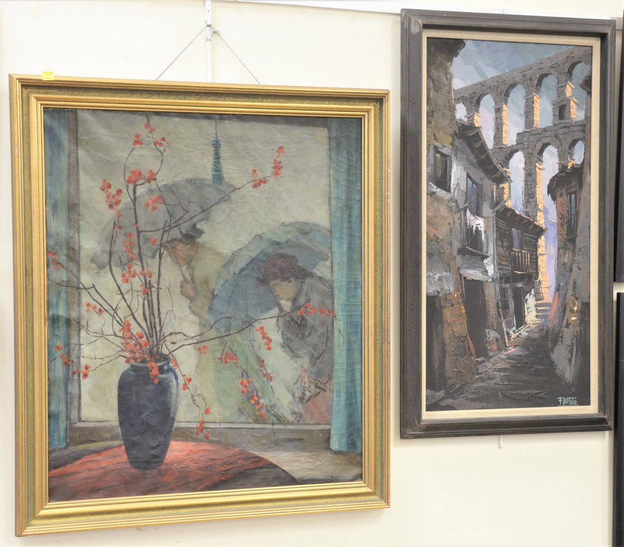 Two Piece Lot, to include an Italian street scene, acrylic on canvas, signed lower right “Faustu”; along with an interior scene with figures in the background, signed lower right “Anne Johnason”, 30″ x 25 1/2″ and 31″ x 16″.