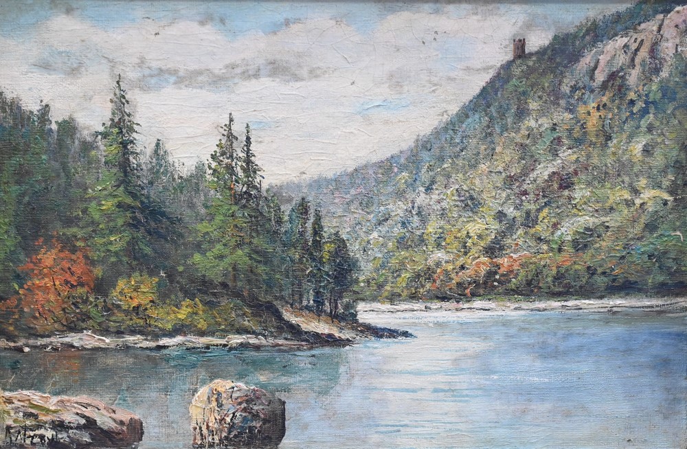 Two Frederick Matzow (1861 – 1938), oils on board, to include lake with path, signed lower right Matzow, in gilt frame, 9 1/2″ x 14 1/2″; along with lake with mountains, signed lower right Matzow, in gilt frame, 9 1/2″ x 14 1/2″.
