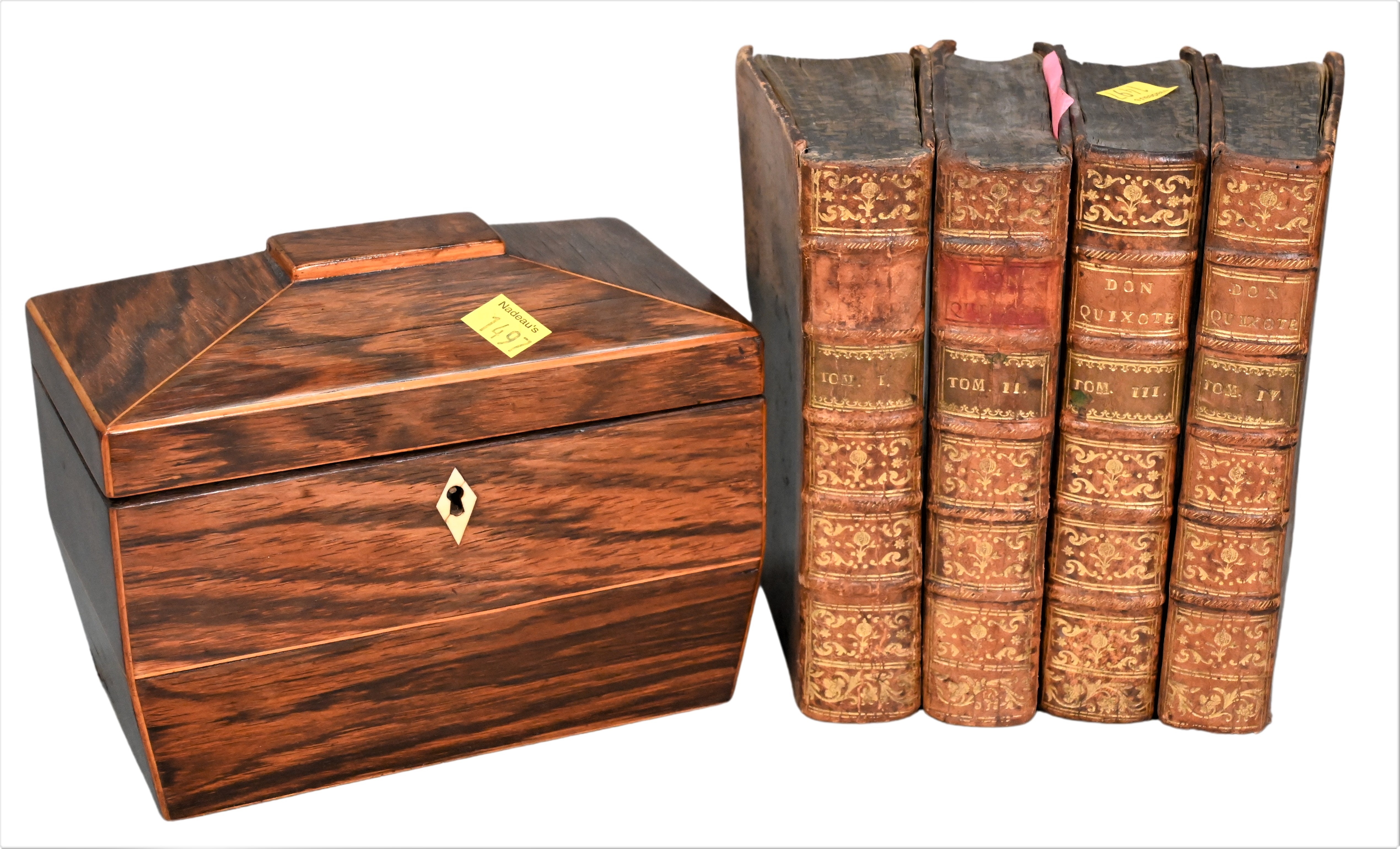 Small Group, to include a rosewood teabox, height 4 1/2 inches, width 8 inches, along with a set of four Don Quixote leather bound books, copyright 1776.