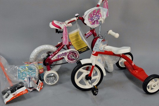 New Raleigh cupcake child’s 12 bike, sparkle pink along with a tricycle in box and an Acclaim training bar and harness, retail value 160.00