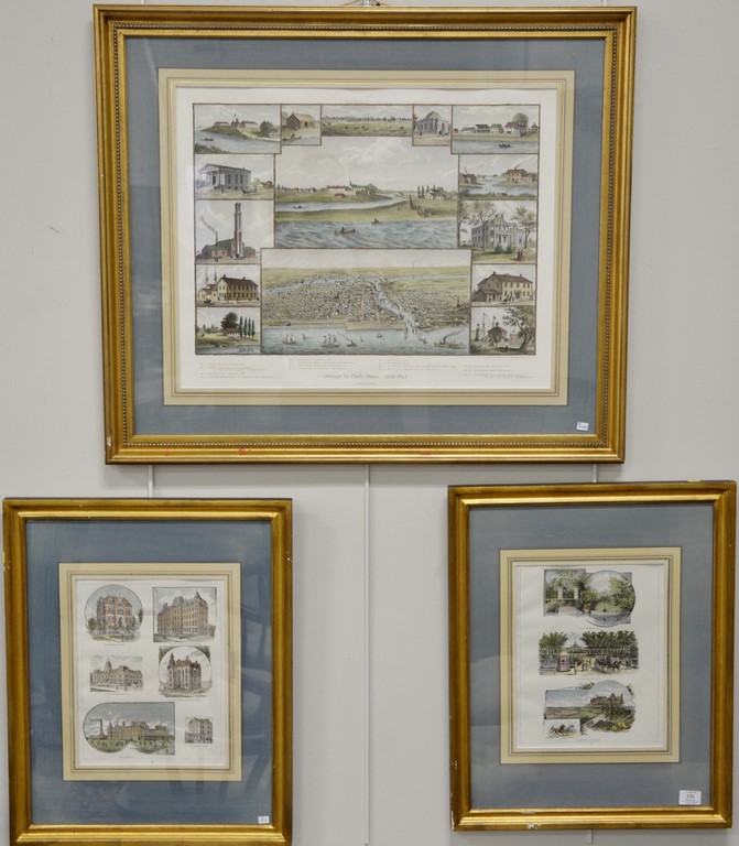 Three piece lot to included Kurz & Allison lithograph Chicago in Early Days 1779-1857, along with two hand colored prints depicting landmarks in Chicago. sight sizes: 20 x 25 1/2 and 13 1/4 x 10 Property from Credit Suisse’s Americana Collection