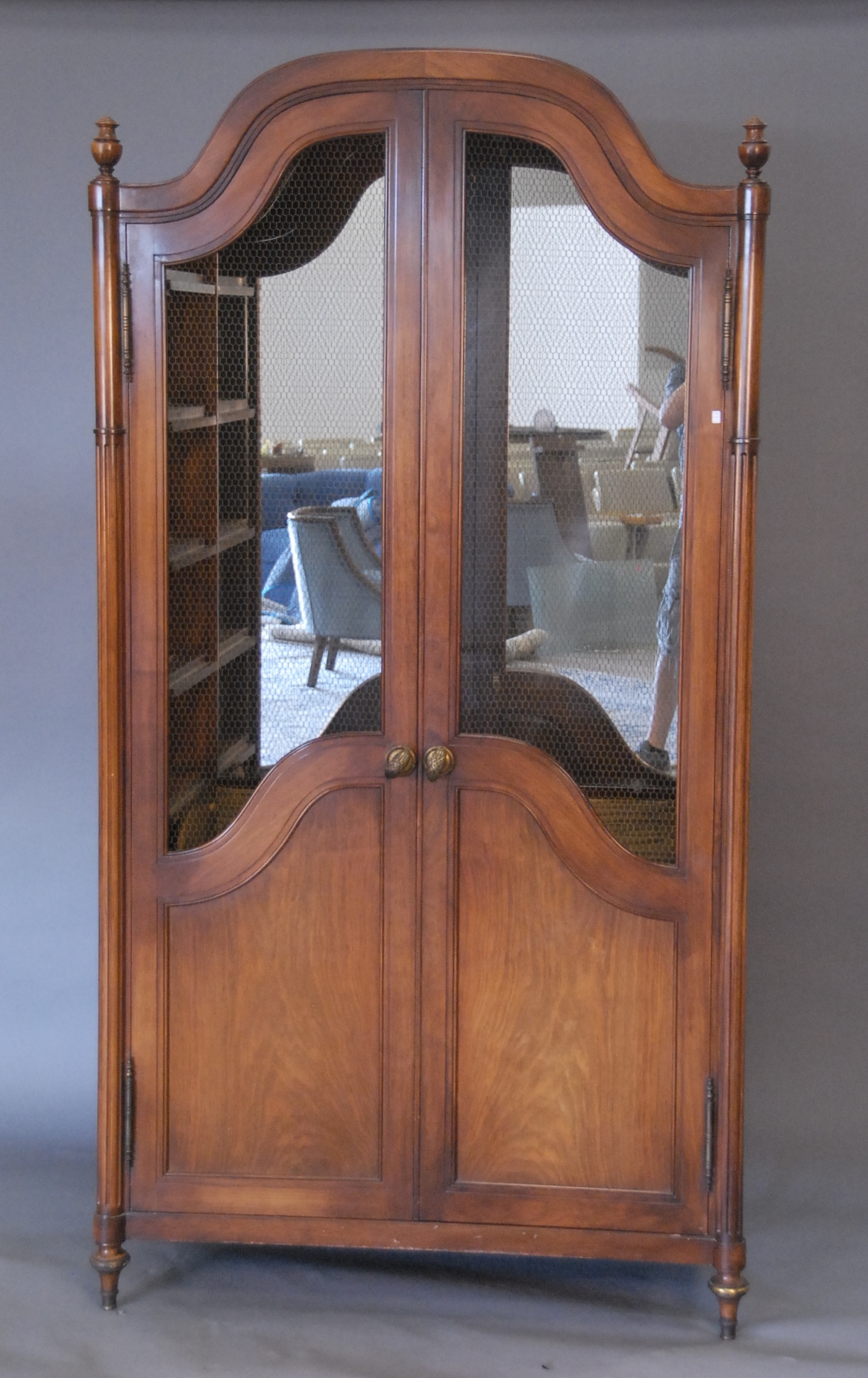 Continental style walnut cabinet with grill work doors, shelves, and drawers. ht. 84 in. wd. 43 in. dp. 20 in.