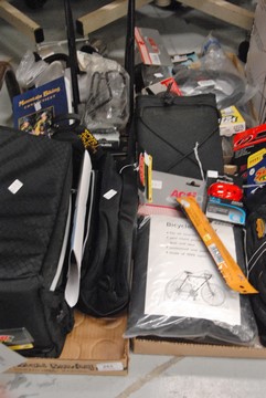 Bike group to include Avenir rack bag, mule sack, water mule sack, Avenir handlebars bag, bike cover, Sigma BC 800 computer, two pairs of gloves, fender, baby sitter rack, rear folding basket, sigma PC3 pulse computer, mirror, lock, approx. retail price 450.00