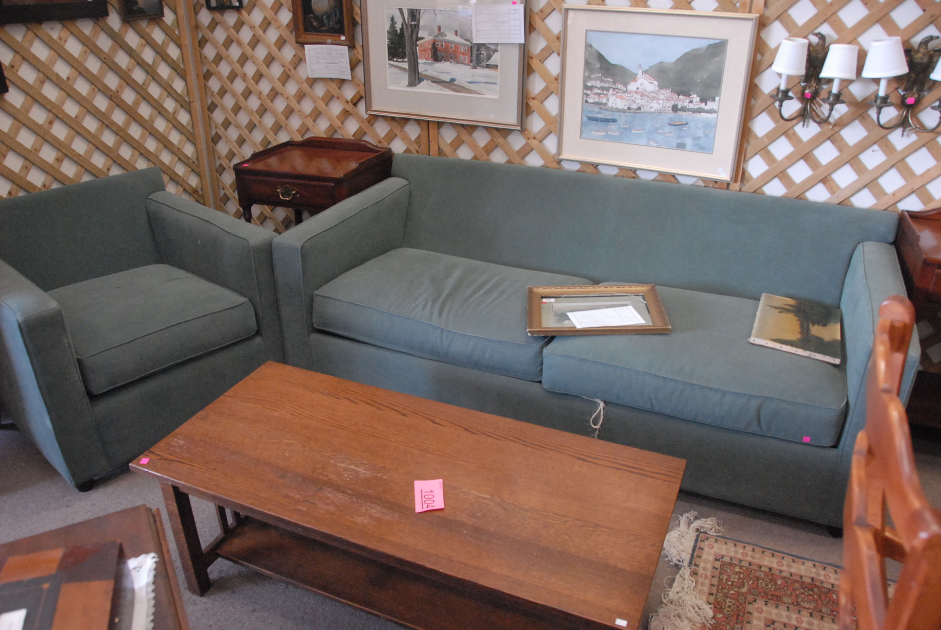 Six tray lots including small enameled tumblers, several pieces of cut glass, cut crystal, porcelain place card holders, metal wall hanging birds, Oriental stands, crystal decanter, vases, and two colored stems.