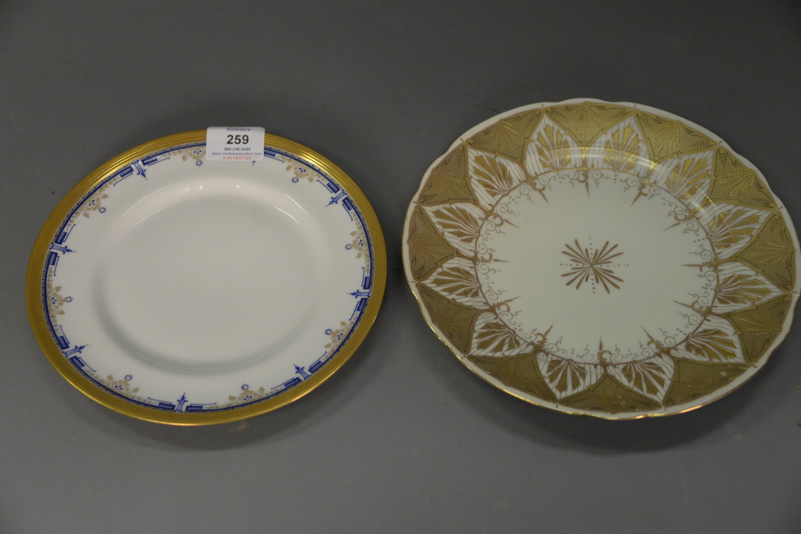 Two sets of plates including set of eight Ovington Brothers Austria plates and s et of PL Limoges plates. Austria: dia. 9 1/2 in., Limoges: dia. 8 3/4 in.
