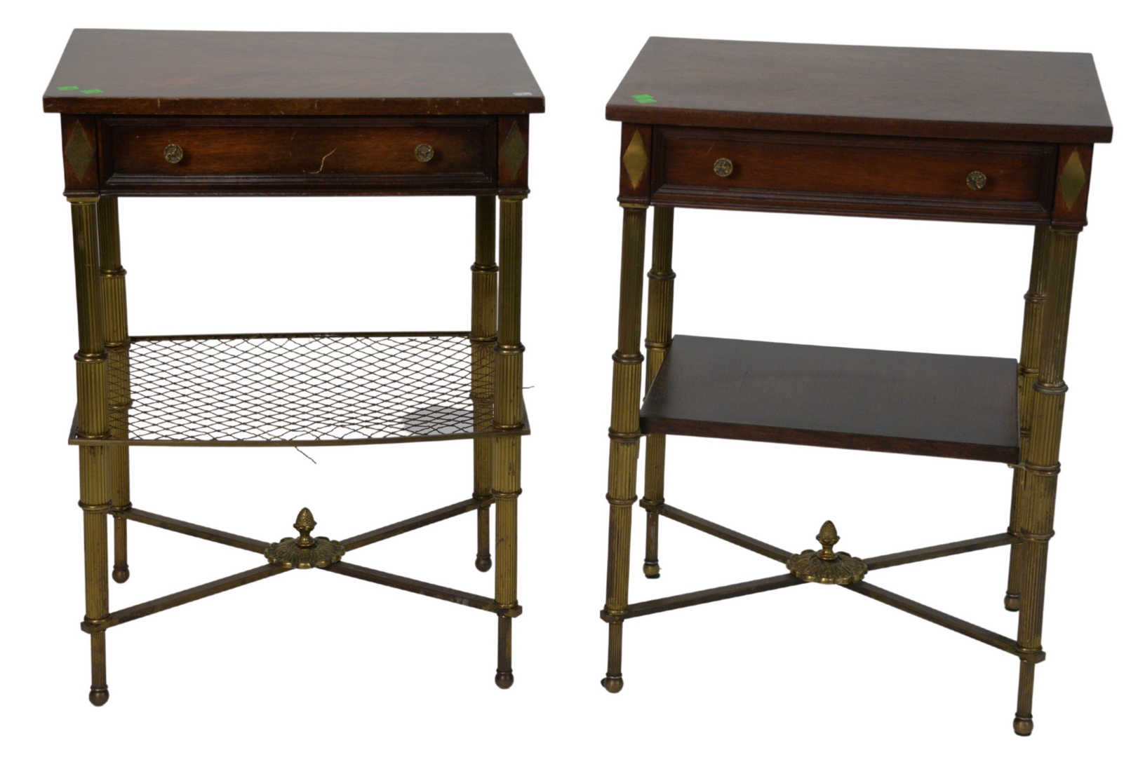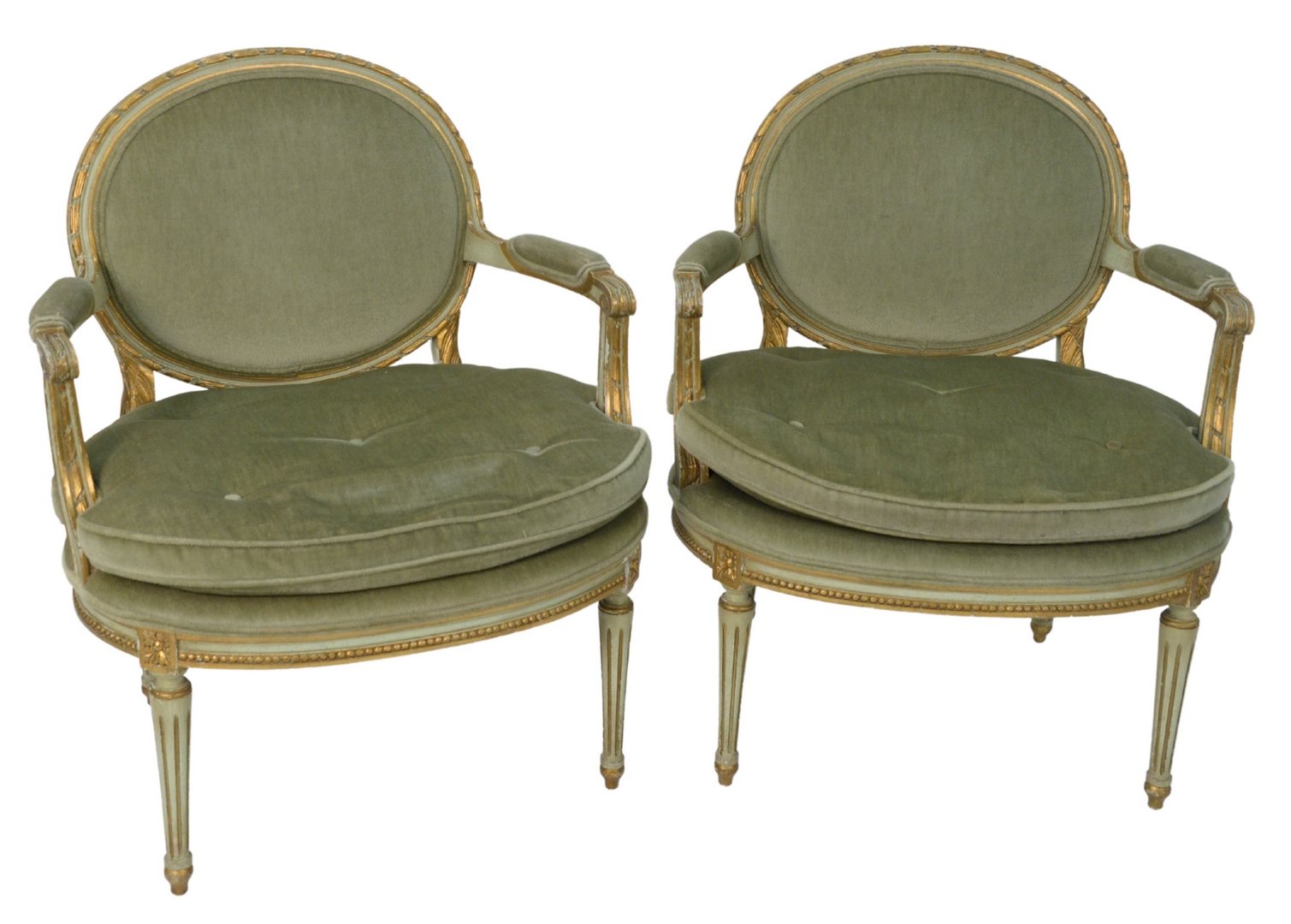 Pair of Louis XVI Style Fauteuil, green and gilt frames, mohair upholstery, height 34 inches, width 27 inches. Provenance: The Estate of Alina Roisen, Park Avenue, New York.