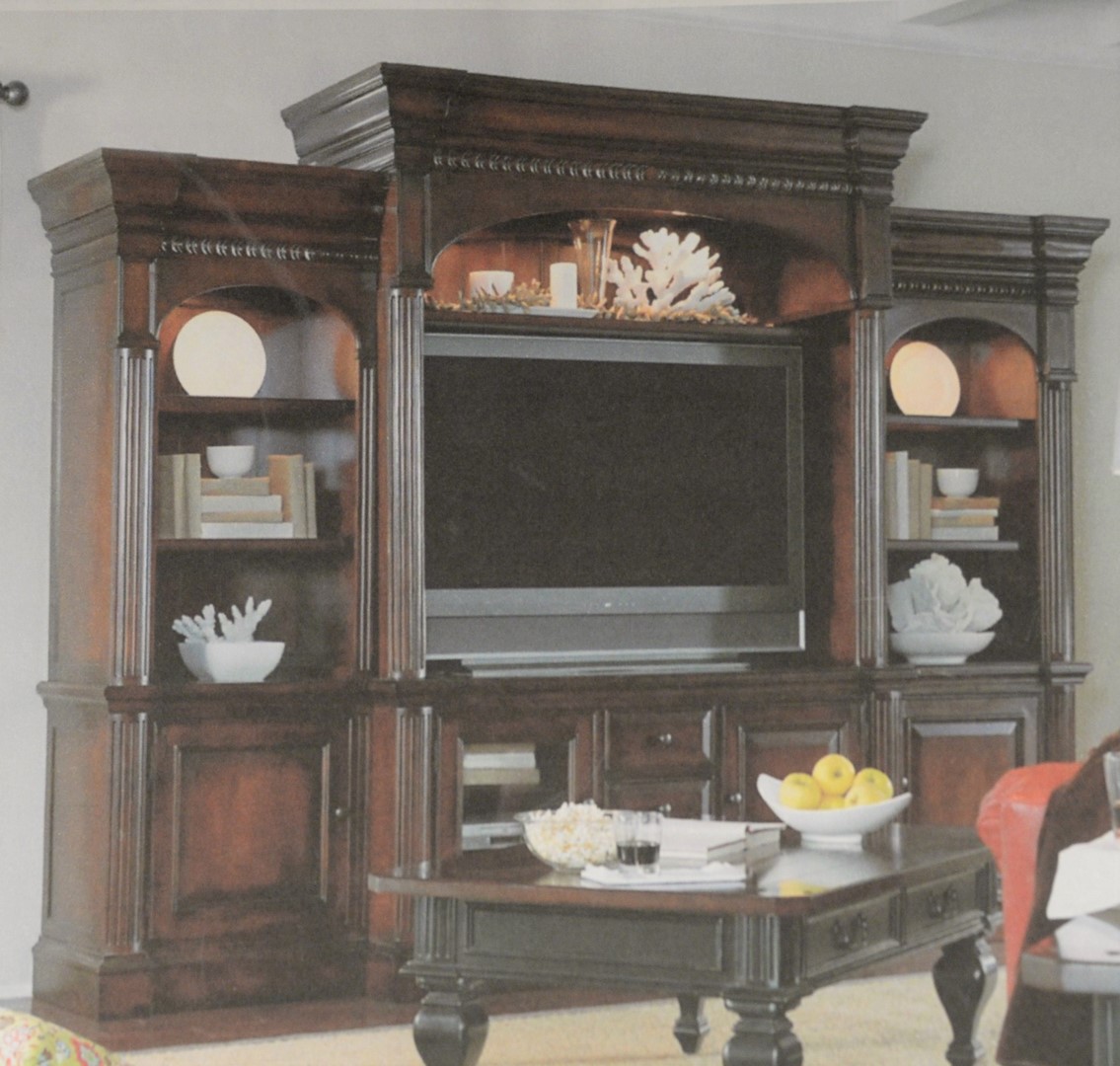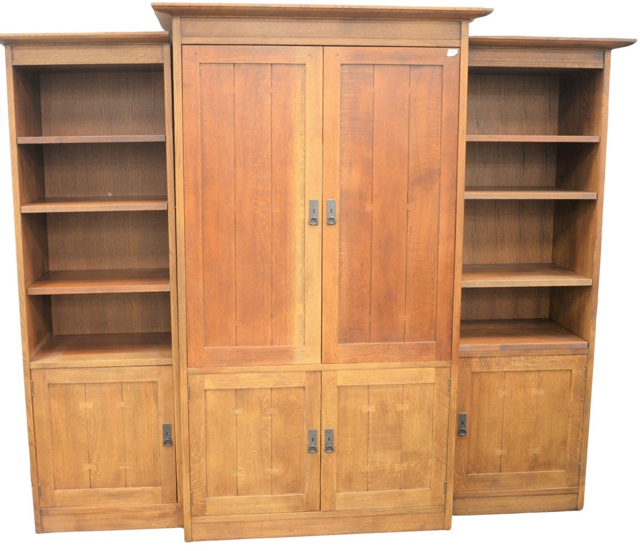 Stickley Mission Oak Entertainment Center, in three parts, with adjustable shelves, side cabinets height 78 inches, width 24 inches, center height 81 inches, width 43 inches, all plus moldings.
