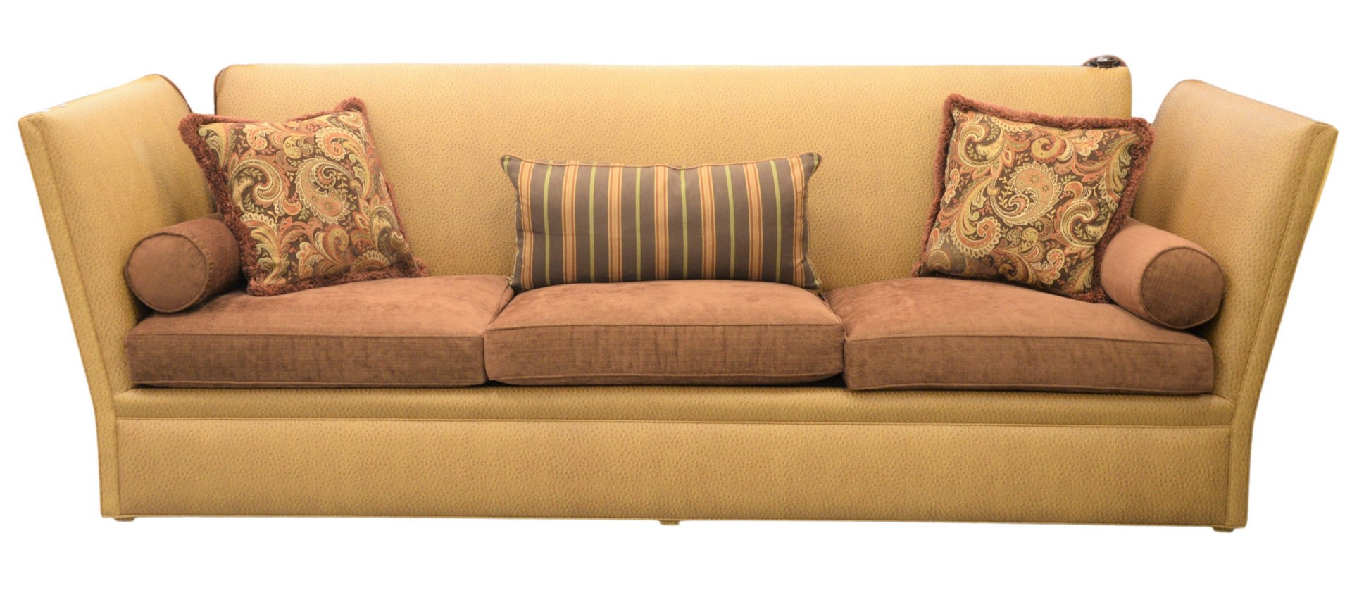 Edward Ferrell Sofa, having Knole drop ends with tassels (not currently fully assembled), upholstered in tan ostrich skin, with brown upholstered cushions, height 46 inches, length 120 inches, depth 38 1/2 inches.